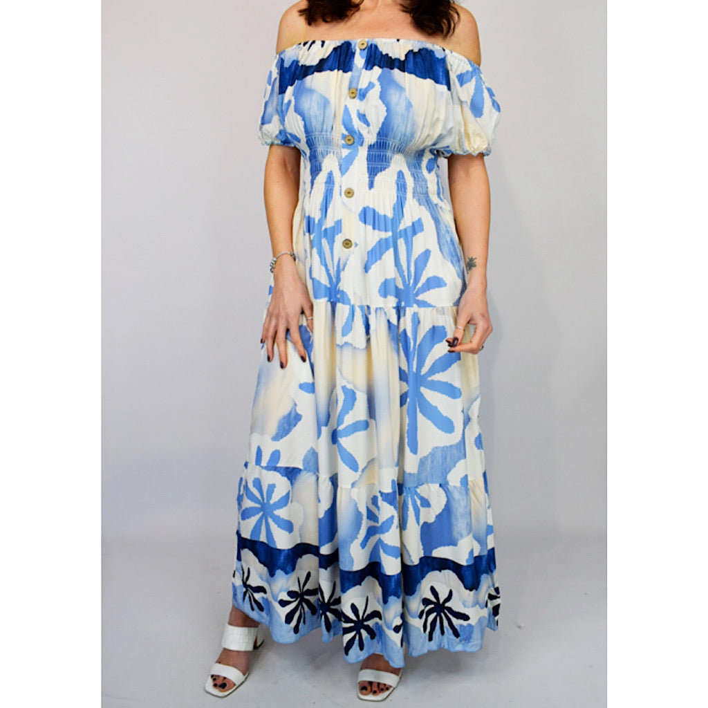 A vibrant summer staple with easy, flattering wear. This off-the-shoulder maxi dress features a striking azure bloom print, button-front detail and a softly elasticated waist for shape without cling. Light, stretchy and comfortable. Ideal for holidays, warm days and relaxed evenings.