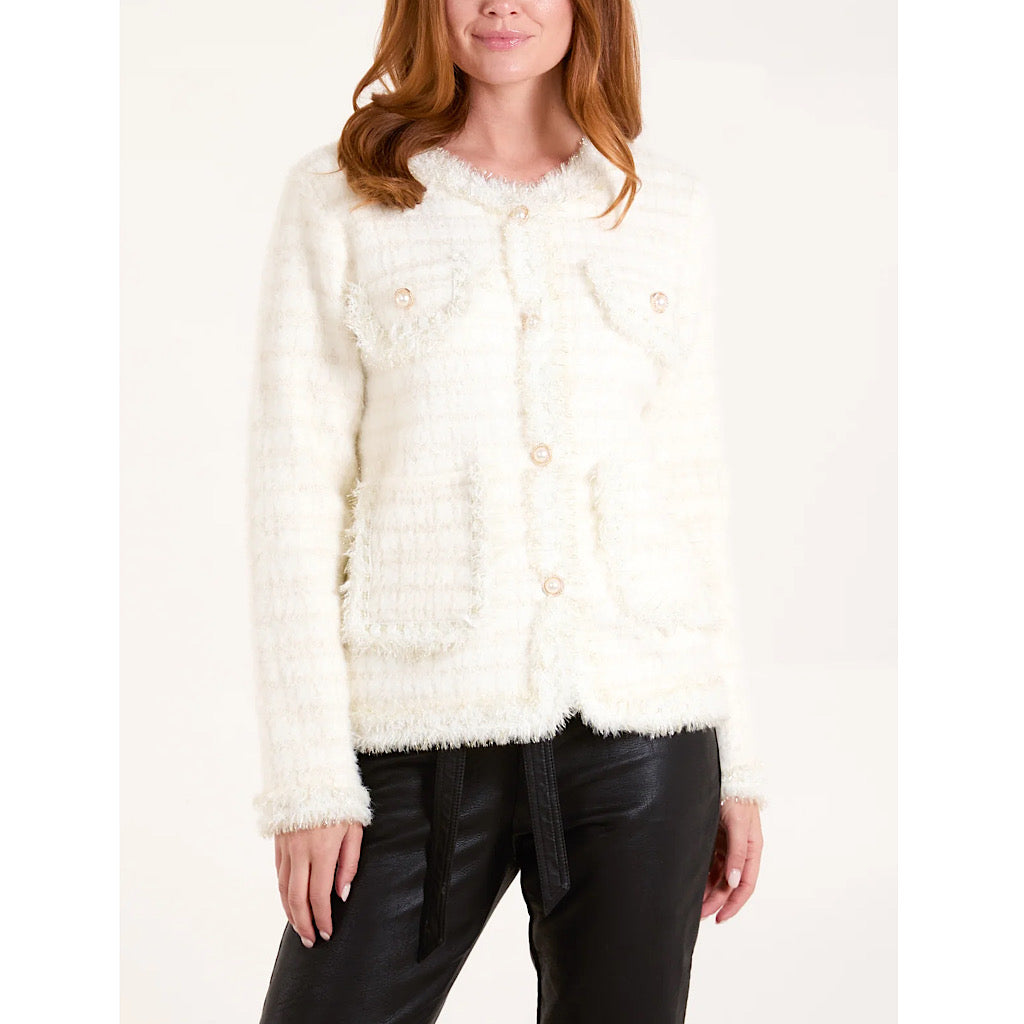 Add a soft, polished layer to your wardrobe with our Ivory Pearl Trim Bouclé Cardigan Jacket – a beautiful blend of cosy texture and classic detailing. Featuring a fluffy check bouclé knit and elegant pearl buttons, this piece gives you the look of a jacket with the comfort of a cardigan.