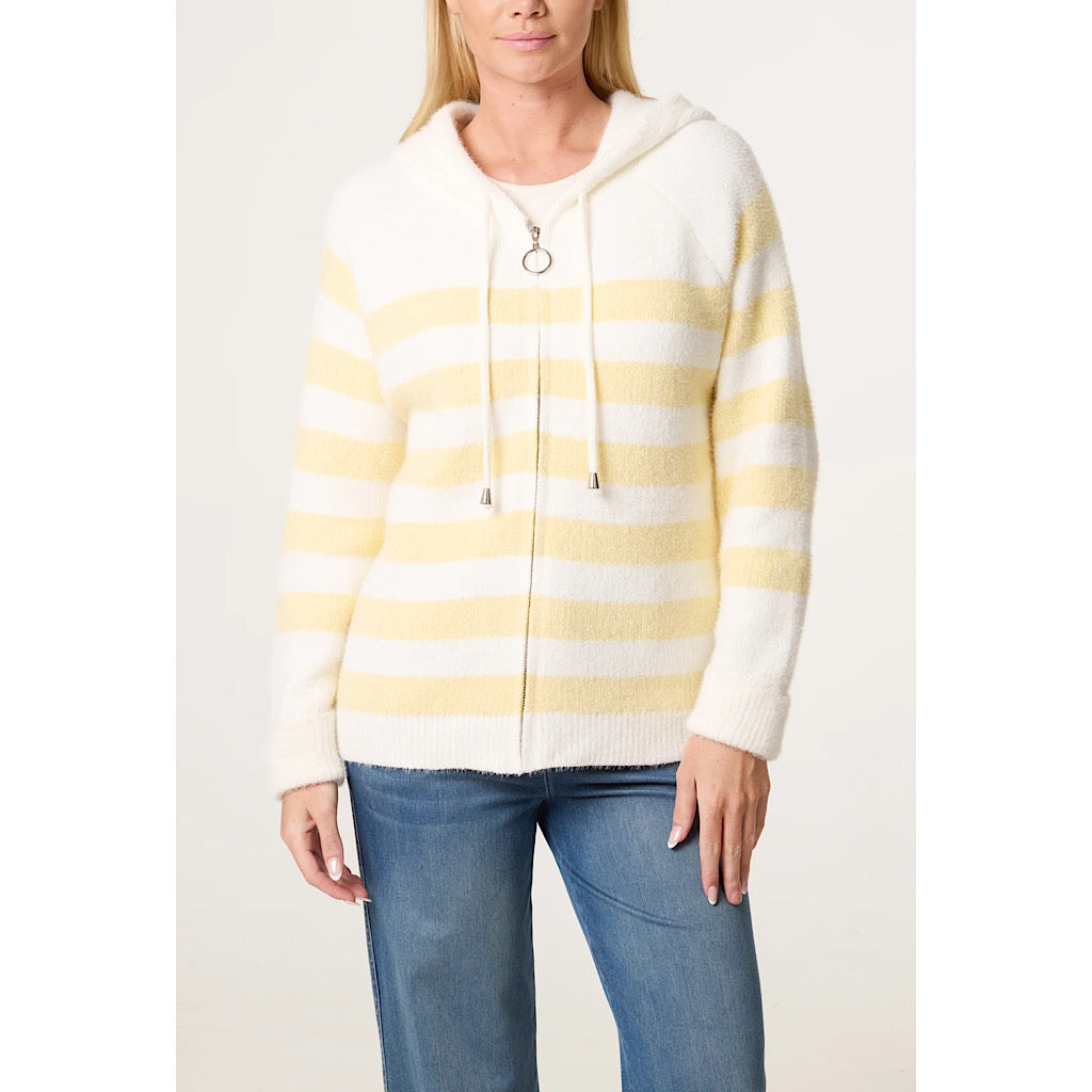 Soft, cosy and easy to wear, this zip-through striped knit hoodie is your grab-and-go layer for everyday outfits. The lemon and cream stripes keep it fresh, while the hood and ring-pull zip add a relaxed, sporty feel.