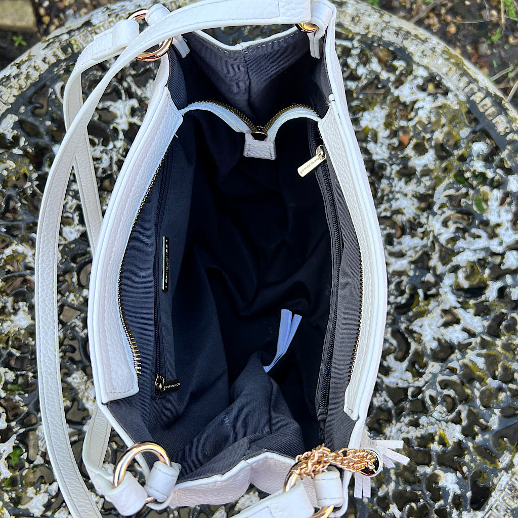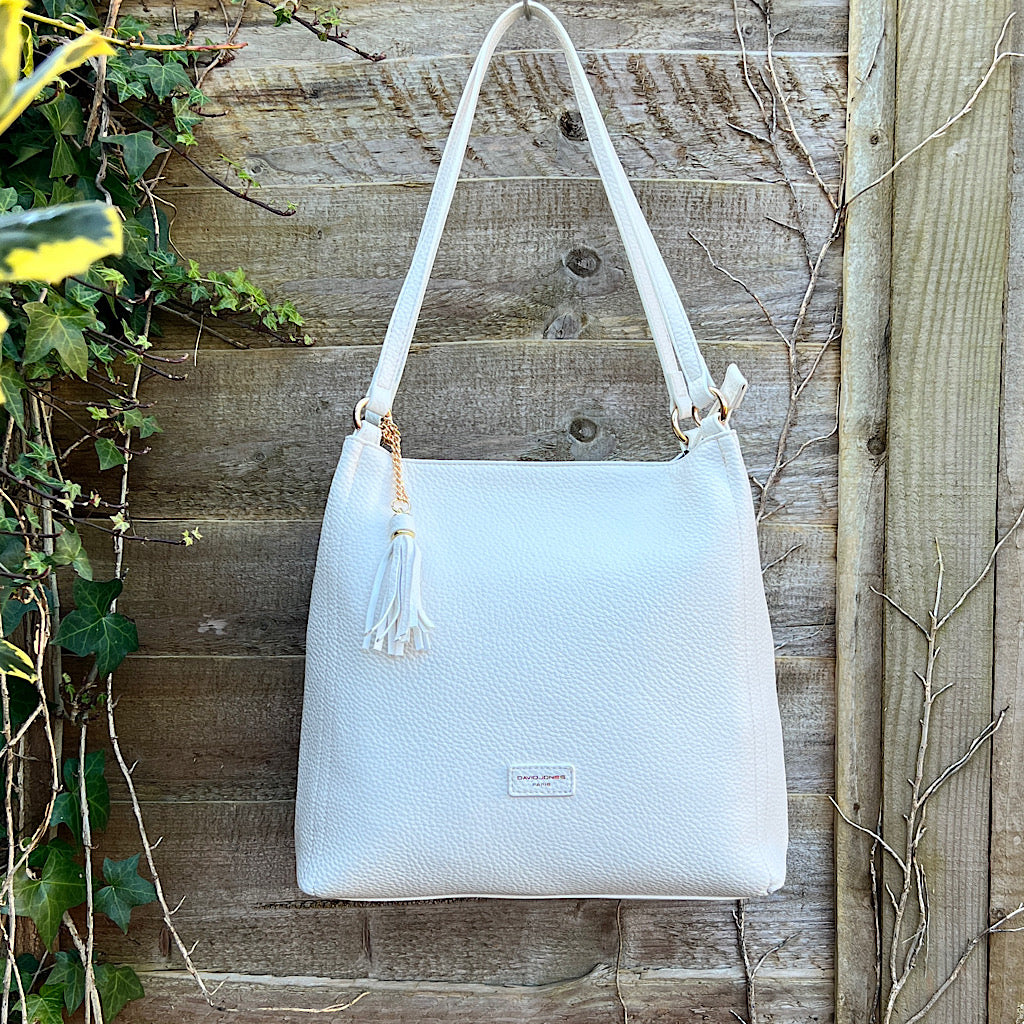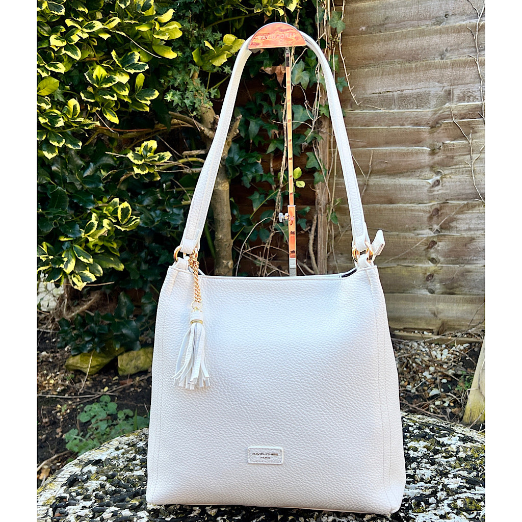 Keep it classy and elegance to your with our White Twin Handle Tote Bag with Tassel Charm, from the trusted David Jones Spring/Summer Collection. Designed to seamlessly combine style and practicality, this tote is a must-have accessory for the modern woman. With its clean white hue, luxurious gold finishing, and charming tassel detail, this bag is a statement piece that’s both functional and fashionable.