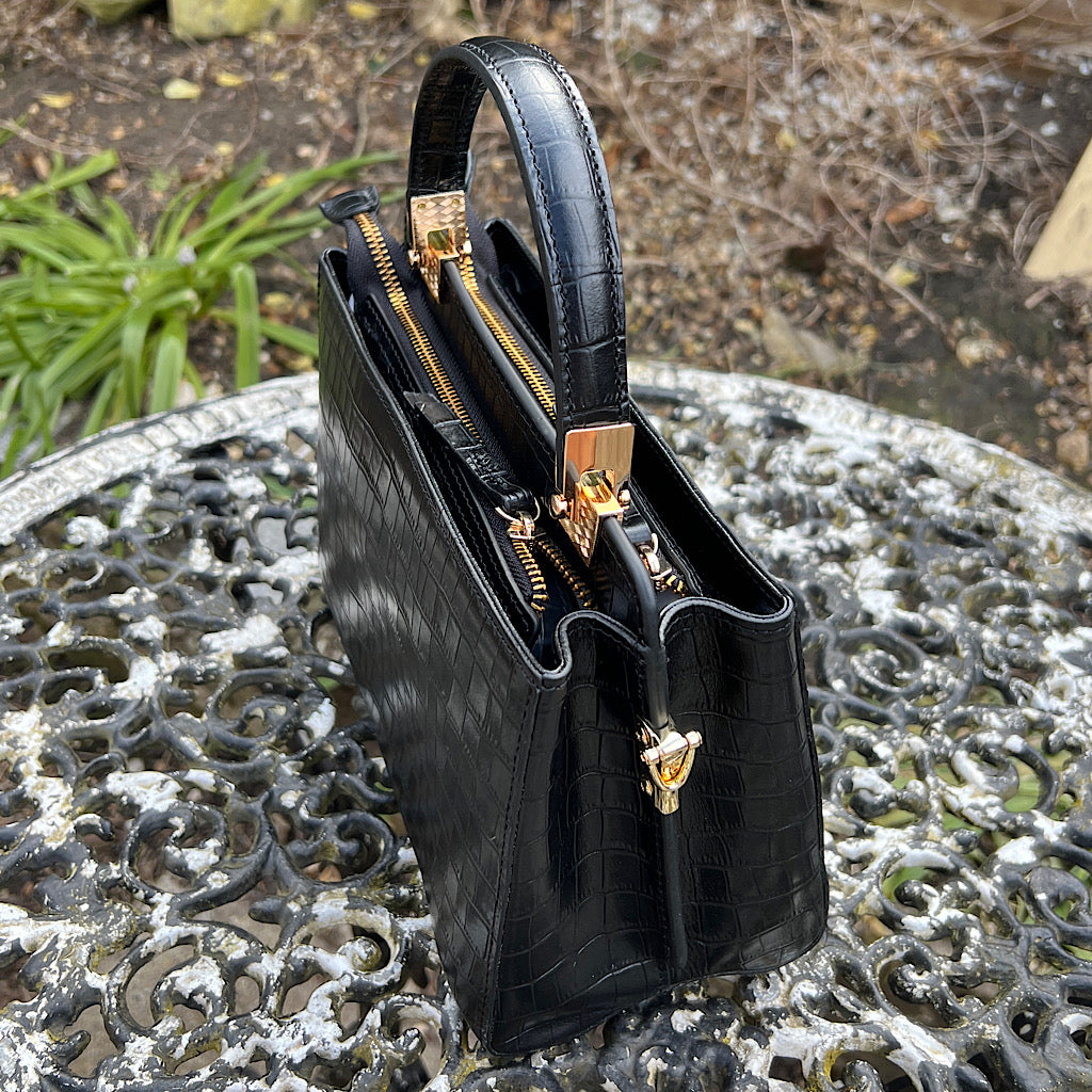 The Black "Aria" Italian Leather Croc Grab Bag is designed for the modern woman who appreciates both fashion and functionality. Whether you're a fashion-forward professional, a jet-setting globetrotter, or a trendsetter hitting the city streets, this bag is your go-to accessory for every occasion. From its versatile wear options to its spacious interior, it's the perfect companion for all your daily adventures, making a stylish statement wherever you go. Elevate your wardrobe and redefine luxury with the Black "Aria" Italian Leather Croc Grab Bag by Katana.