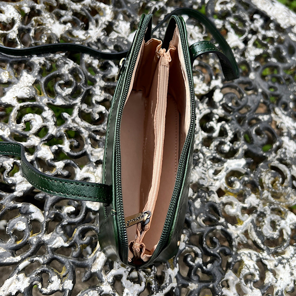 Who is it for and How to Use: Ideal for fashion-forward individuals seeking both flair and practicality. From busy professionals to trendsetters, this bag complements any outfit. Wear it across your body or on the shoulder, adjust the strap, and step out confidently with all your essentials in tow. Elevate your style effortlessly with our Green "Lia" Italian Leather Crossbody Bag.