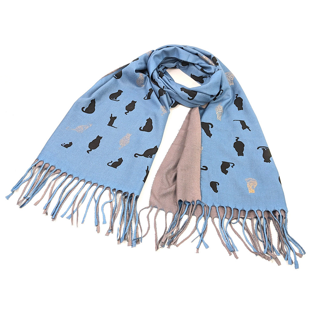 A soft, easy-to-wear scarf covered in playful cat silhouettes, finished in a calm blue and taupe reversible design. Light, warm, and simple to style, it’s an everyday layer with a touch of charm. The woven tassel edging keeps it looking tidy while still relaxed. Approx size: 70 x 180cm.
