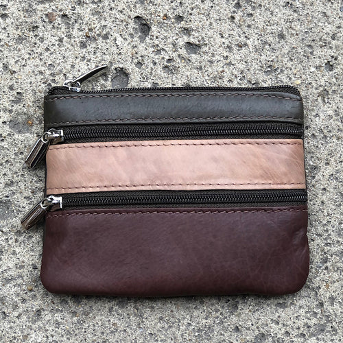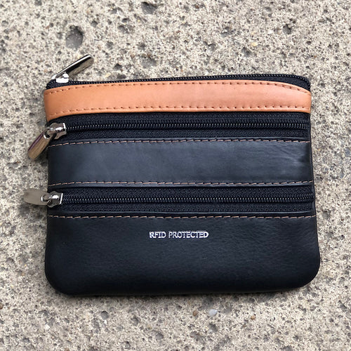 Zen Multi Colour Soft Leather 3 Zip Coin Purse | Black & Tan