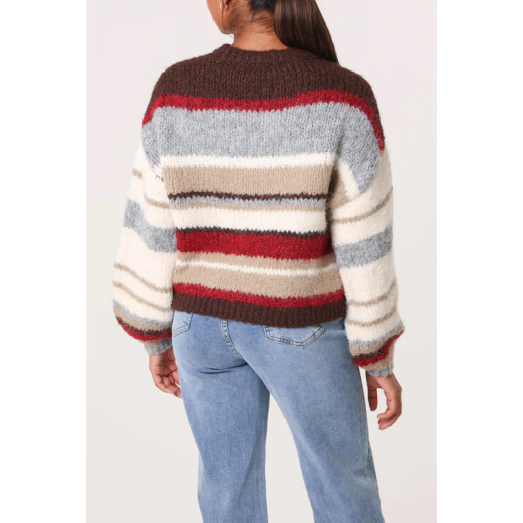 Embrace cosy colour and effortless style with our Autumn Hues Striped Knit Jumper – a soft, oversized knit designed to brighten cooler days. Featuring a beautiful mix of grey and warm-toned stripes, this wool-blend jumper adds a playful yet sophisticated touch to your autumn wardrobe. The relaxed silhouette and voluminous sleeves make it as comfortable as it is eye-catching.