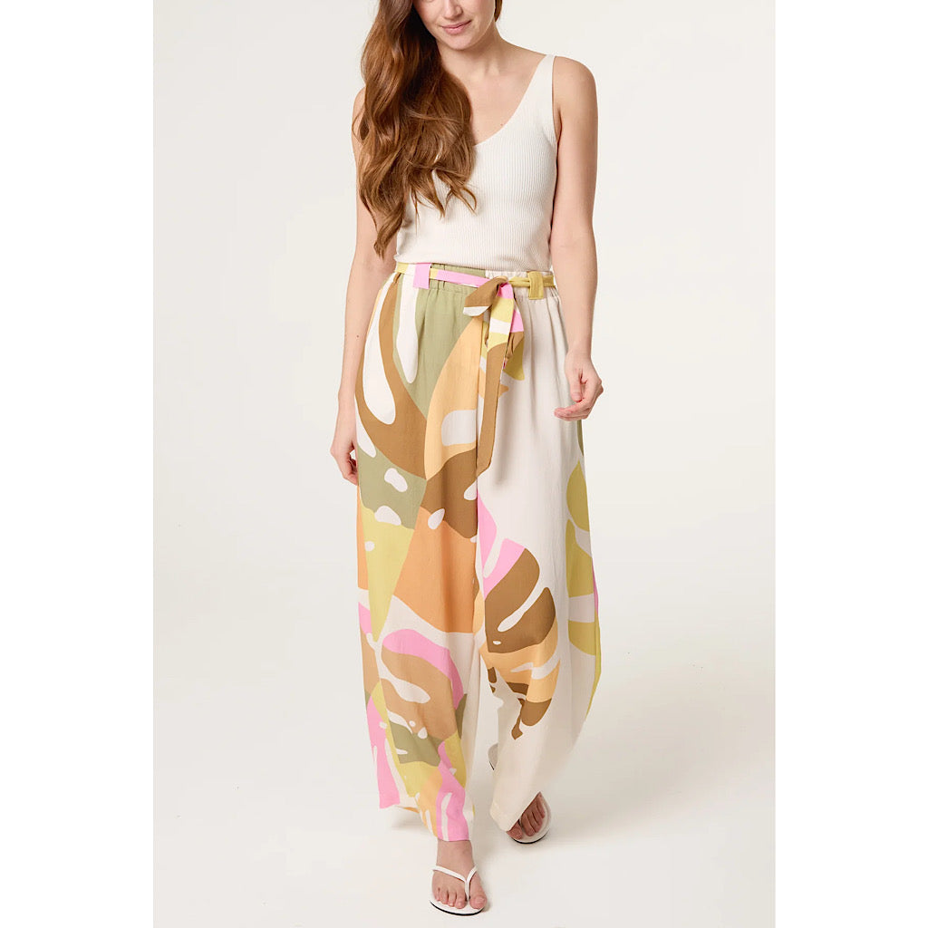 The Sahara Sunset Wide-Leg Trousers feature a soft neutral base with abstract leaf-inspired shapes in warm tan, sage, soft pink and ochre tones. The wide-leg cut creates a flattering, elongated silhouette, while the elasticated waistband and tie belt offer comfort and shape at the waist.